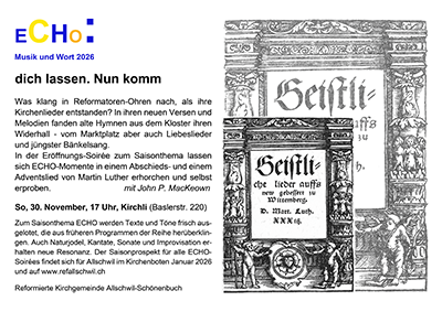 Musik und Wort - dich lassen. Nun komm So, 30. November, 17 Uhr, Kirchli Was klang in Reformatoren-Ohren nach, als ihre Kirchenlieder entstanden? In… ...